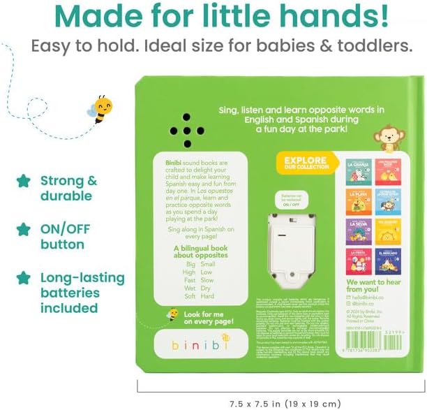 • ๐——๐˜‚๐—ฟ๐—ฎ๐—ฏ๐—น๐—ฒ & ๐— ๐—ฎ๐—ฑ๐—ฒ ๐—™๐—ผ๐—ฟ ๐—Ÿ๐—ถ๐˜๐˜๐—น๐—ฒ ๐—›๐—ฎ๐—ป๐—ฑ๐˜€. Binibi bilingual English-Spanish books for babies & toddlers 1-3 are durable and feature hard covers, thick pages and rounded corners - they are made for little hands and are easy to clean! All Spanish musical sound books feature an on/off button for extended battery life, and easily replaceable batteries. 3 AG10 batteries in every book.