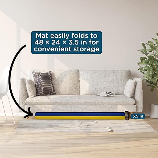 • FOLDING GYM MAT FOR EASY STORAGE: This mat quickly unfolds for play time and folds for storage just as quickly. Each of it's 5-sections fold taking the size down from 48 x 48 x 1.5 inches to just 24 x 48 x 4 inches.