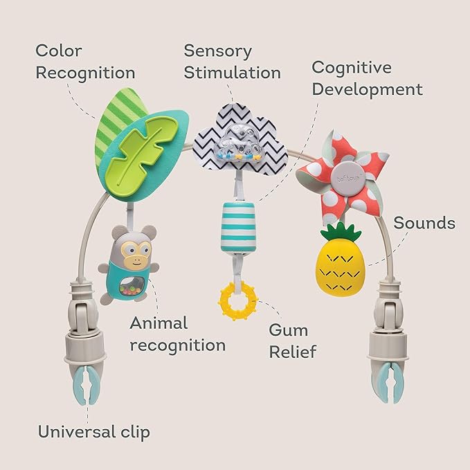• Stimulating Instrumental Toys for Sensory Development Keep your baby entertained and engaged with this flexible stroller arch featuring 3 musical toys—maracas monkey, cymbal pineapple, and chime bell with teether. These fascinating sounds support sensory development, auditory stimulation, and fine motor skills from an early age.