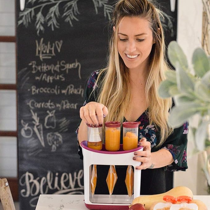 • EASY, 4-STEP PROCESS: Just insert and screw in a pouch, pour your puree, press to fill, and you're done. Clear tubes with measurement lines help portion perfectly every time
