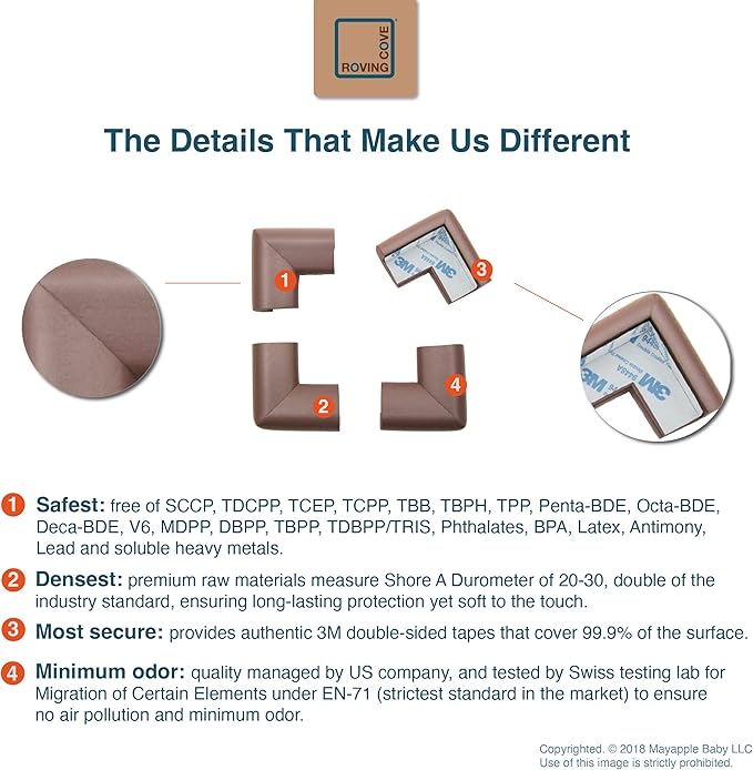• DESIGNED IN USA: Includes 4 large premium, pre-taped, baby proofing corner guards. All text and photos/images in this product listing are copyrighted materials. Copyright: 2012 Mayapple Baby LLC, Brooklyn NY, USA.