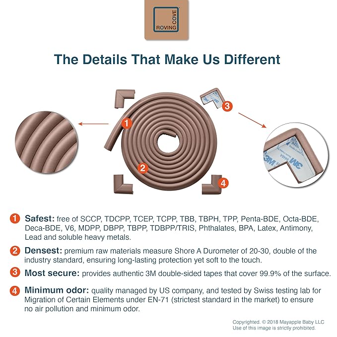 • CLEAN SAFETY: Roving Cove uses safe and pure raw material and was the first brand to make foam safety bumpers without the use of toxic flame-retardant chemicals (SCCPs). Our edge corner guards contain no BPA, no phthalates, no heavy metals, no latex, no SCCPs. Inherently flame-resistant; passed flammability tests under US regulations.