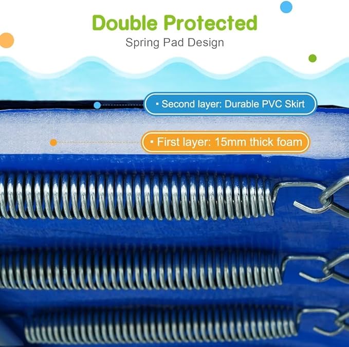 • 【Premium Quality Materials for Max Safety】Galvanized rust resistant springs(7 inch) offer impressive bounce. Anti-UV jumping mat (made of PP) provides more weight capacity. 6ft higher enclosure net (made of environmental PE) ensures absolute safety and fastness when jumping. And the poles are padded with 10mm foam, can protect your kids from banging against the steel pole.