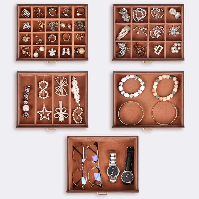 • 5 removable drawers for maximum jewelry storage. The deeper bottom drawer has only one compartment. Its size is 7.31"L x 5.81"W x 2.25"H. The other 4 drawers have the equal size. Their size is 7.31"L x 5.81"W x 1.00"H. Drawer 1 has 20 equal size compartments; Drawer 2 has 12 equal size compartments; Drawer 3 has 4 equal size compartments; Drawer 4 has just one compartment.