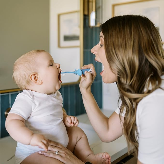• BABY’S FIRST TOOTHBRUSH AND TOOTHPASTE. Safely clean baby’s first teeth and gums - just add a pea-sized drop of toothpaste to the toothbrush and use small circular motions to clean.