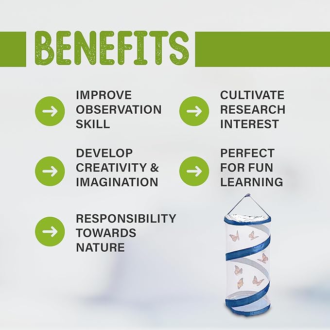 • Large Reusable Cage: The 18" pop-up net cage with easy-access zipper accommodates all 30 butterflies and makes observation easy and exciting. It can collapse for for easy storage in your classroom for the next time you rear butterflies.
