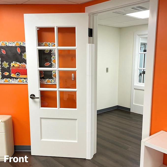 • PEACE OF MIND FOR PARENTS - Offers reassurance to parents and caregivers by ensuring that curious hands and fingers are protected from door-related accidents in high-traffic areas like homes, condos, cabins, daycares and/or apartments. While most childproof door products only cover the latch side of the door, this product goes beyond by safeguarding the hinge side gap, providing comprehensive protection for little ones.