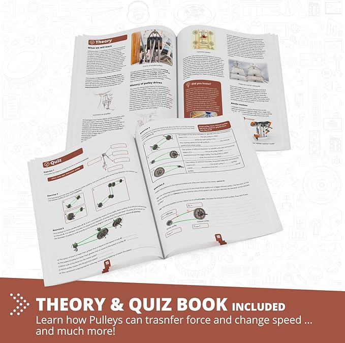 • EXPLORE PULLEYS: Kids discover the power of pulley drives with reduced friction, boosting force and speed! BUILD 8 working models like a material lift, a stationary bike, a construction crane and more.