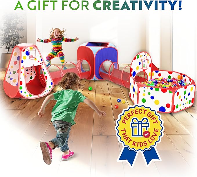 • PLAYTIME COMES TO LIFE with this 5-piece Premium Ruby Red indoor & outdoor pop up playhouse in Polka Dot Design! Includes spacious kids play tents, large ball pit with basketball hoop, interactive crawl tunnels obstacle course that will keep children entertained for hours. Kids can enjoy endless possibilities by customizing tent and tunnel configurations! A must-have toy for any active kid, toddler, baby, cats & dogs, and even adults.