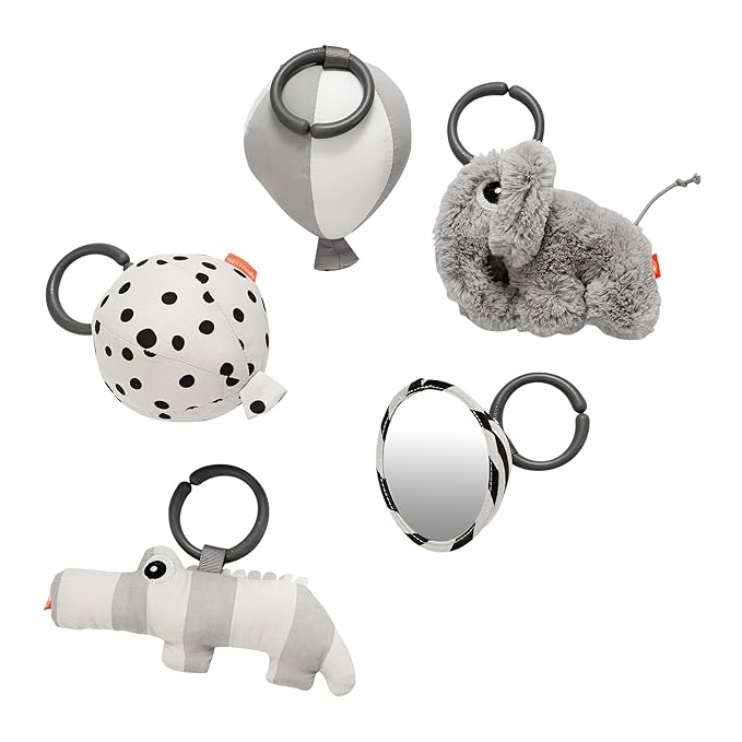 • let your baby enjoy crinkle, rattle and chime sounds - Croco will crinkle when touched, while Elphee rattles. The balloons contain a chime and a bell, and there's even a fun mirror included