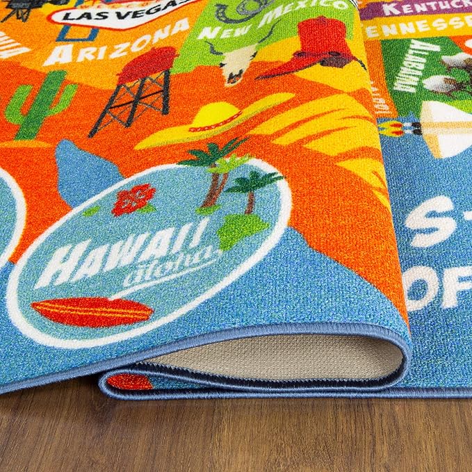 • BRING U.S. GEOGRAPHY TO LIFE: Explore all 50 states, Washington D.C., and bordering countries like Mexico and Canada with this colorful USA map rug. Includes landmarks like Mount Rushmore and the Mississippi River.