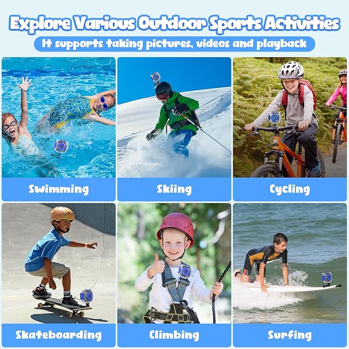 • Up to 100ft Kids Waterproof Camera: Underwater camera for kids comes with a strong waterproof case that protects to depths of 100ft, great pool toys for kids ages 4-8. Prograce children camera encourages kids to play outdoor sports like swimming or biking