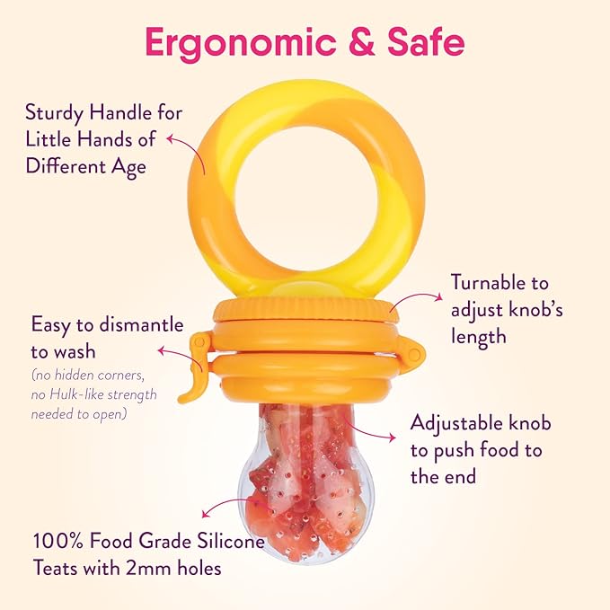 • ★ MOST VALUE FOR MONEY BABY FRUIT / FOOD FEEDERS & TEETHERS (2 PCs w 4 Silicone Teats) – NatureBond Baby Fruit Feeders and Teethers are designed in "APPETIZING" candy-like colors that stimulate baby’s appetite for consumption of natural nutrients from fruits and vegetables. It is also a safe way to introduce our little ones to solid food while they go through weaning and teething phase. The All-IN-1 feeder can also soothe baby's teething discomfort by massaging the gums through chewing.