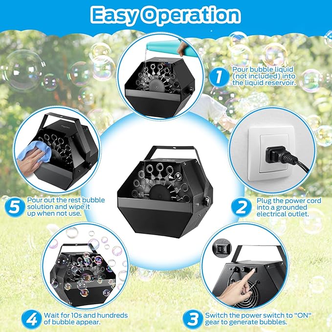 • Easy to Be Used in Manual: Just set the bubble machine for toddlers on an even surface, fill the tank with bubbles solution, switch the power on/off switch to "ON" gear, then this bubble machine for kids will start to work automatically, it is simple and easy to operate for all ages.The best ratio of bubble liquid is: bubble oil: water = 1:13 (Not Included)
