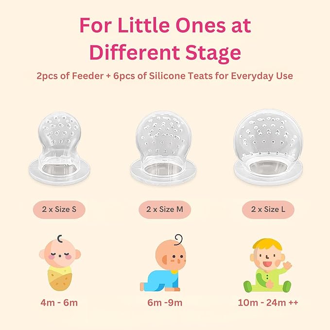 • ★ ALL SIZES INCLUDED – 2 x Feeders and Bonus pack of 4 silicone sacs / teats for different ages of baby/toddlers. (2 Large Sizes Sacs are pre-packed with Feeders. Additional 2 Small Sizes and 2 Medium Size included for parents to have more options). We value you and your baby's comfort and convenience. Unlike other feeders which do not provide different sizes, we recommend customers to use an appropriate size for your little ones.