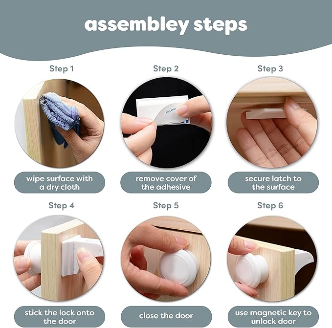 • Installation Tips for Optimal Safety: Before securing with adhesive, check for hidden metal components inside your cabinet doors that may interfere with the function of these magnetic child safety cabinet locks. Move the lock around the door to find the ideal position where it operates smoothly, then install it for lasting performance.