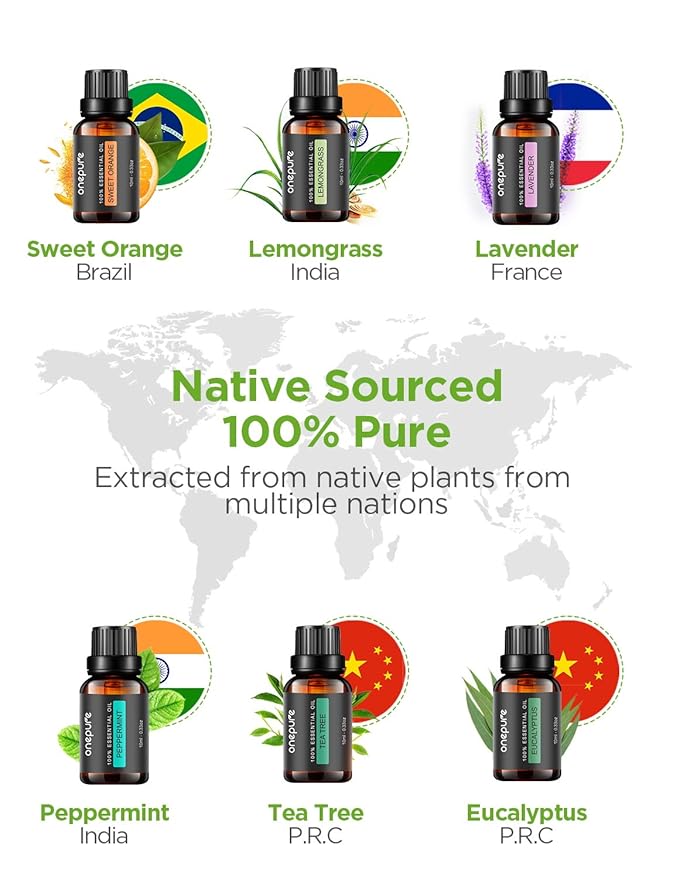 • Native Sourced, Bottled in the USA, 100% Pure: 6 scents include tea tree, lavender, eucalyptus, lemongrass, peppermint and sweet orange, which are extracted from native plants from multiple countries. With premium quality, each drop is 100% pure with no additives, fillers, bases or carriers added.