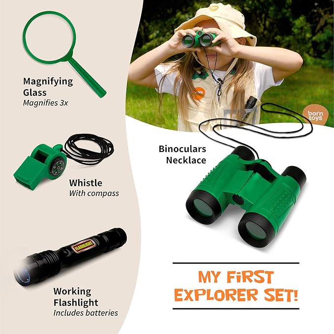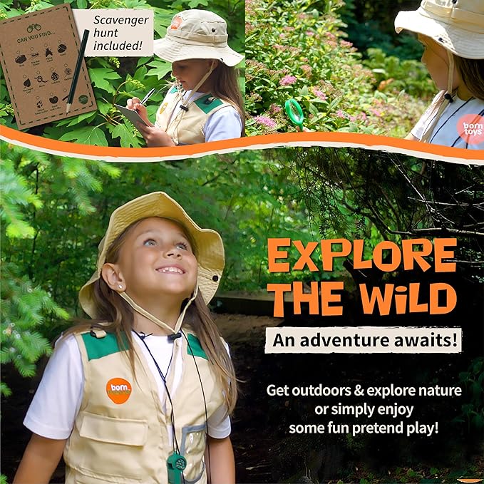 • EXCELLENT QUALITY: Our toy explorer kit for girls & boys exploration set has the highest quality & has the safety standards you deserve. This kids outdoor explorer kit with backyard safari hat, also comes with washable vest, binoculars, scavenger hunt, pencil, magnifying glass, flashlight which includes batteries, whistle w/ compass and storage bag for your bug kit or bug collection kit for kids