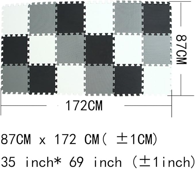• ☺ Play Mat Size: the size of one piece:30 x 30 x 1CM (11.8 x 11.8 x 0.4 inches); 18 pieces mats cover area: 172cm x 87cm (±1CM) / 69" x 35"(±1inch)