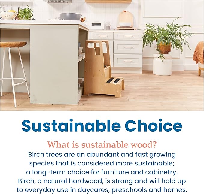 • Two-Step Stool: Countertop-height step stool designed for little helpers to grow confidence as they cook, wash hands, and brush teeth in a home, preschool, or daycare