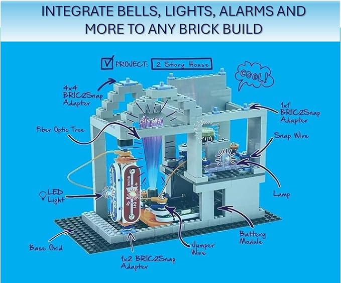 • BUILD WITH BRICS Combine Snap Circuits with building bricks to create awesome combinations of construction and circuitry! With Bric-2-snap technology, kids can connect their builds with Snap Circuits lights, sounds, moving parts, and 3-D circuits to invent and make their projects go!