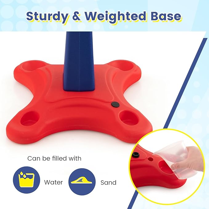 • 【Safe Material & Stable Base】 Made of premium HDPE and with ASTM certification, this basketball hoop stand is non-toxic, odorless and durable. The thickened pole and wide base ensures great safety and stability when playing competitive games. And there is a hole for you to fill the base with water or sand to increase stability.