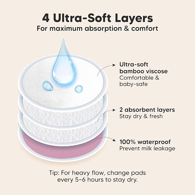 • Great For Leakages – Leakage is a thing of the past with our 4-layer nursing pads. KeaBabies Nursing Pads feature three layers of ultra-absorbent viscose derived from bamboo, sealed with a protective waterproof outer layer for extra security on the nipple pads. Tip: If you experience a heavy flow, please replace breast pads every 5-6 hours.