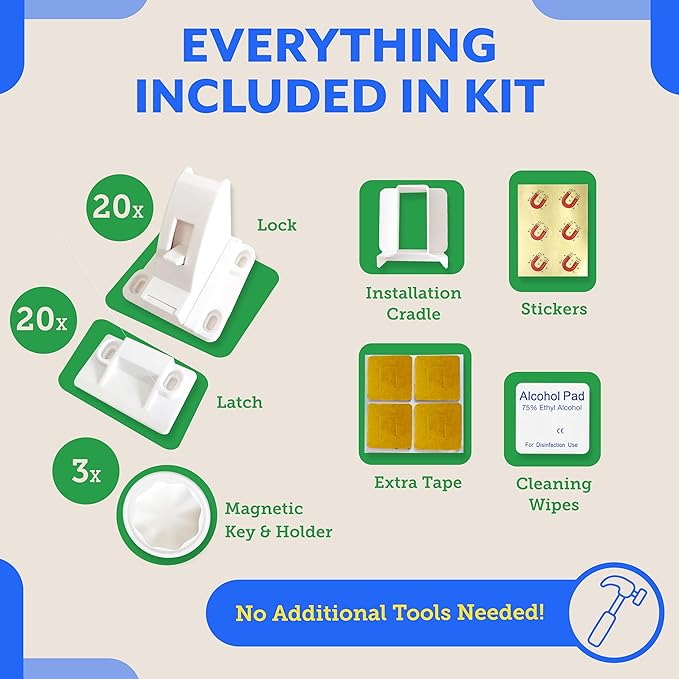 • Complete Child Proofing Kit: Take baby safety to the next level with our comprehensive kit, which includes 20 magnetic cabinet locks, 3 keys, 20 latches, an installation cradle, and extra TESA adhesive tapes.