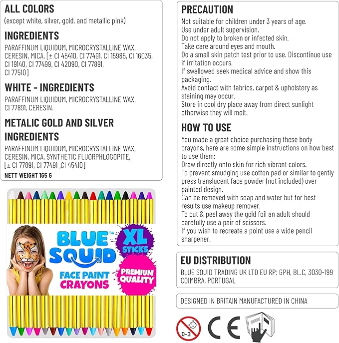 • πŸ›‘οΈ π—¦π—”π—™π—˜ 𝗙𝗒π—₯ π—¦π—˜π—‘π—¦π—œπ—§π—œπ—©π—˜ π—¦π—žπ—œπ—‘ - Blue Squid's face paint for kids non toxic washable formula ensures a fun, hypoallergenic experience, perfect for even the most delicate skin. Our crayon sticks are US compliant, paraben-free and fragrance free. They are super easy to clean up - just wipe the face paint off with makeup remover or soapy washcloth.