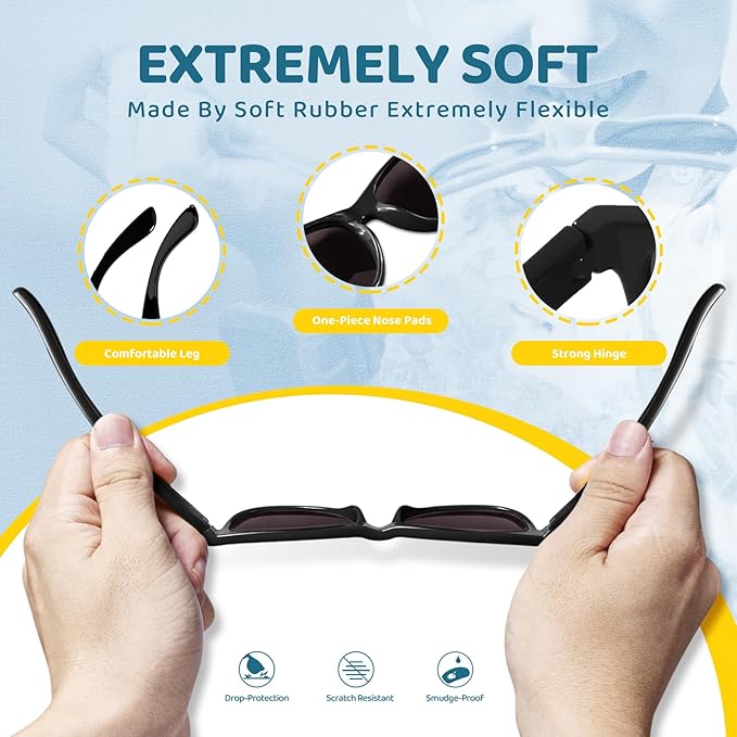 • SAFE AND COMFORTABL - RIVBOS sunglasses frame is made of soft silicone and unbreakable material, which is not easy to break, very durable, and also provides a comfortable wearing experience.