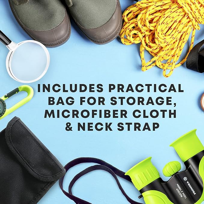 • ADVENTURE ACCESSORIES: These exciting binoculars come with a real compass and magnifying glass to encourage small kids to have adventures; Includes a practical cloth bag for storage, a microfiber cloth to clean the glasses, and a neck strap to secure the binoculars