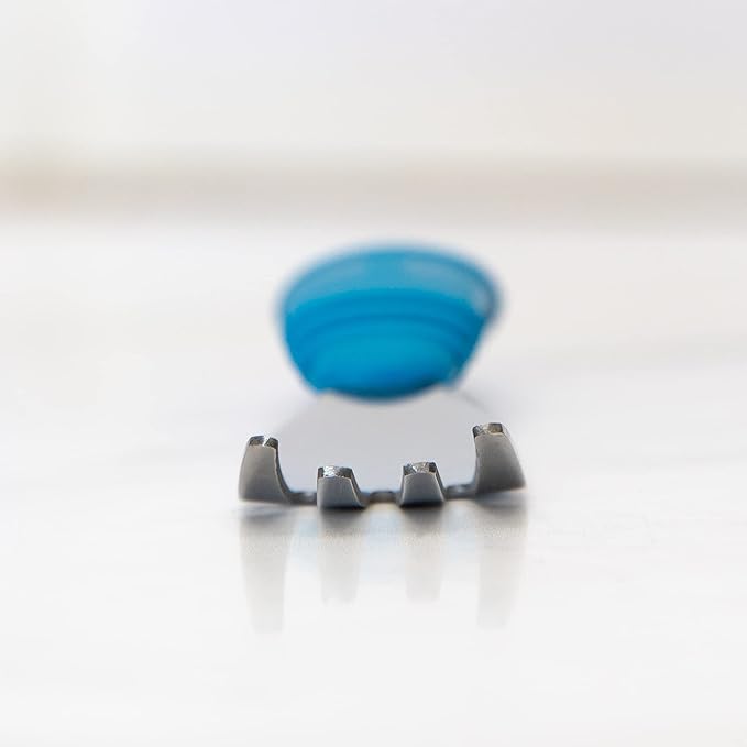 • TODDLER UTENSILS – This set is sized and shaped just right for self-feeding; concave stainless-steel fork and spoon heads help keep food on the utensils; outer fork tines are bent (like a spork) to help pierce solid foods and keep food on the fork