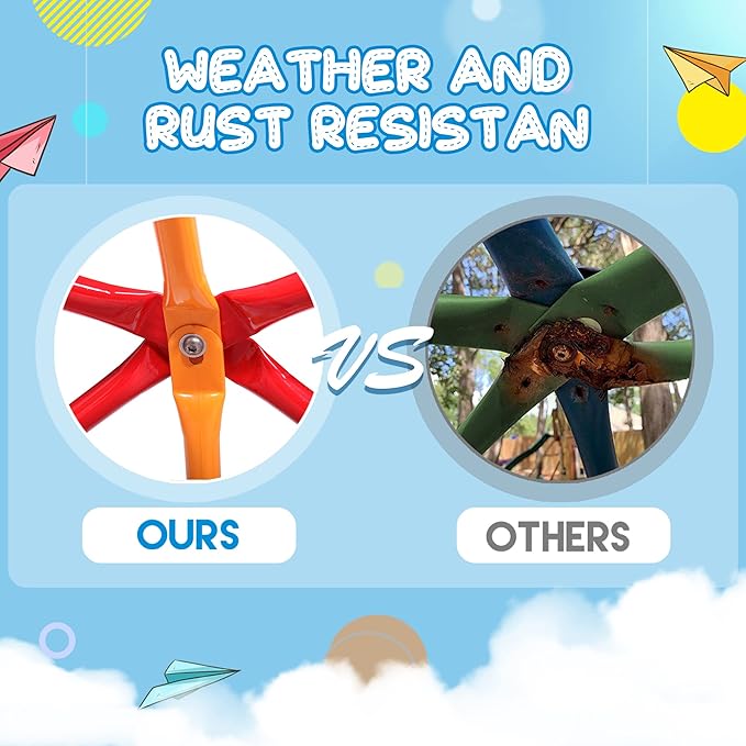 • Ultra-Safe Construction: Premium Safety Assurance: Our climbing dome features a reinforced steel frame supporting 500 lbs - exceeding safety standards for kids outdoor play equipment. The monkey bars for backyard integration and rounded edges make it safer than traditional playground sets for backyards, while textured grips ensure secure holds for little hands. Ideal for ages 3-8 with an impact-absorbing design.