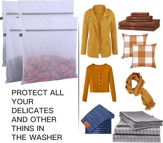 • 【Come in 4 Pieces】XXL Size(24 x 24 inch), perfect for washing coats, heavy clothing, bedding, linens, pillowcases, bed sheets, duvet covers, tablecloths, mattress covers, long dersses, plush toys