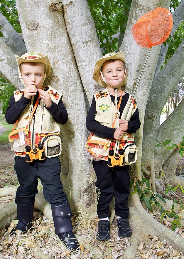 • 🐌 Each kit is durable, high quality and includes, Toy BINOCULARS, Safari/Hunting VEST with bright Jungle pattern, HAT with quick release to prevent choking. Great for dress up, pretend play, wildlife and nature exploration. The perfect Christmas gift!