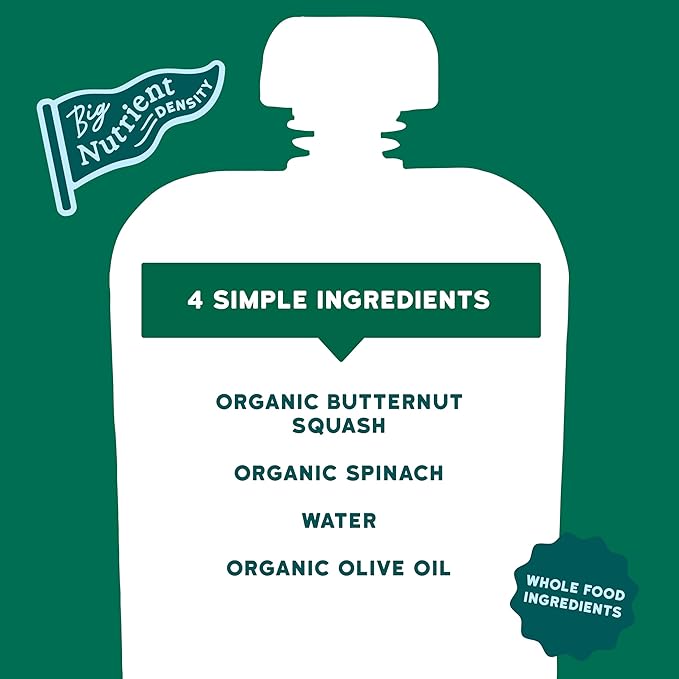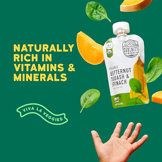 • Savory Veggie Power: Dive into the rich flavors of Serenity Kids' Butternut Squash & Spinach pouches, perfect for your little fall baby puree adventures. Packed with organic baby food goodness, these pouches are made for tiny hands and growing taste buds