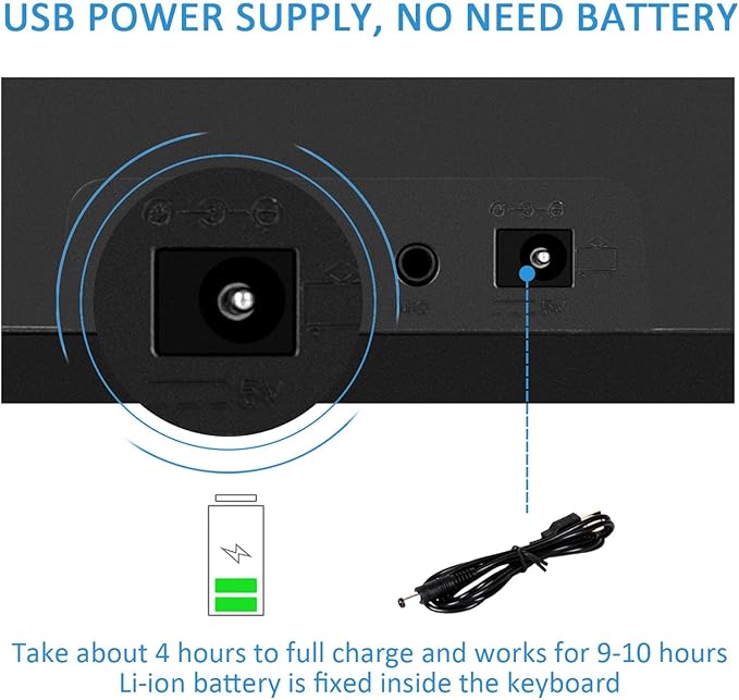 • USB / Battery Powered -- Electronic keyboard built-in battery and can be charged by USB cable. No need to plug the battery, it will be more environmental, and also easy to carry, can be played indoor or outdoor. Kids piano toy made of ABS material, sturdy and non-toxic. Fine workmanship and smooth edge design, safe for kids.