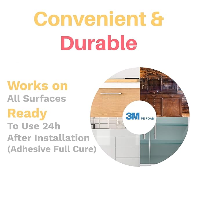 • Hassle-free installation: No tools required! With pre-applied 3M adhesive just peel the film, stick it on and you are all set for baby proofing your drawers and cabinets in less than 5 minutes.