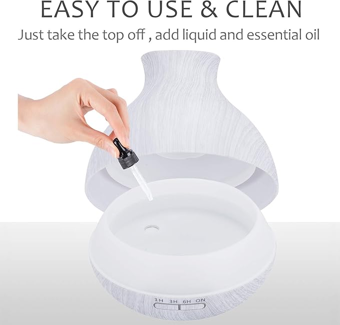 • SLEEK and ELEGANT LOOKING, 8 COLORS: The aromatherapy essential oil diffuser is made of plastic with a faux wood look, BPA-Free water tank, fine design, and good quality, it blends naturally with the most home decor. The changeable colored lights bring an elegant view, create a relaxing atmosphere to the room, and make your life more colorful.