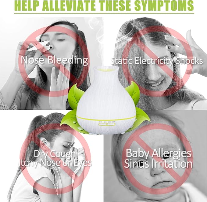 • REDUCE ALLERGIES SYMPTOMS IN DRY ENVIRONMENT: It helps improve your breathing and sleep if you spend long hours in an air-conditioned room and feel dry skin and thirst. This aromatherapy diffuser could provide a large amount of fresh air for those who suffer from Dry Cough, Itchy Nose or Eyes, Allergies Sinus Headaches, Sleeping Problems, or Dry Skin. A great housewarming or hostess gift idea for your parents, friends, and business partners.