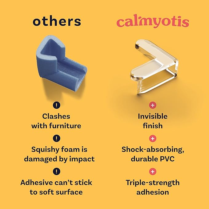 • Optimal Density: Other corner protectors are made from too-soft silicone or foam, marketed as being desirably “squishy”. But adhesives don’t stick well to soft materials, so little hands can tug them off easily. Our premium PVC protects while softer alternatives can dent inwards or flake off over time.