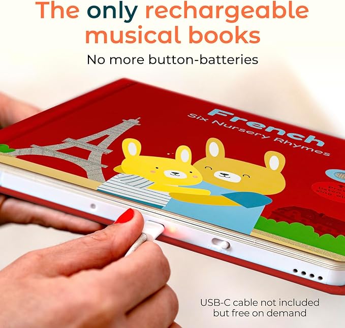 • Sized perfectly for small hands, our French Nursery Rhymes Sound Book is a must-have for music books for toddlers aged 1-3. With an easy on/off switch button and batteries included, it's a convenient and interactive choice for hours of educational play