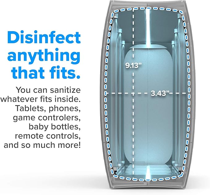 • CLEAN WHATEVER FITS: The HomeSoap can fit large tablets, remots, toys, baby bottles, headphones, and more! The large capacity sanitizing bay can disinfect anything in the 13.18" x 3.66 " x 9.24" internal area.