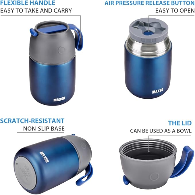 Insulated Thermo Food Jar for Hot & Cold Food for Kids Adult, 17 oz Soup Thermal Hot Food Containers for Lunch, Triple Layer Insulation Stainless Steel Food Jar with Spoon(Blue)