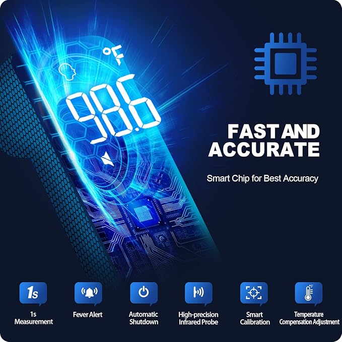 • For accurate readings: 1) Hold 1.5" from forehead center 2) Clean skin & wait 10 mins 3) Allow 10s between measurements. Works best in stable room temps (50°F-104°F).