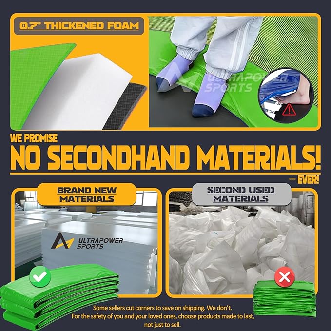 • 🏆️【Trusted Quality ULTRAPOWER SPORTS trampoline pad】 As a top-tier trampoline replacement mat brand, we prioritize safety and durability. We believe that you who appreciate quality will know how to choose wisely. The double industrial-grade stitching and triple-layer construction (PVC + PE + padding) outperform other flimsy covers. Whether replacing worn-out mats or upgrading old trampolines, choose our trampoline pad replacement that balances affordability with professional-grade performance.