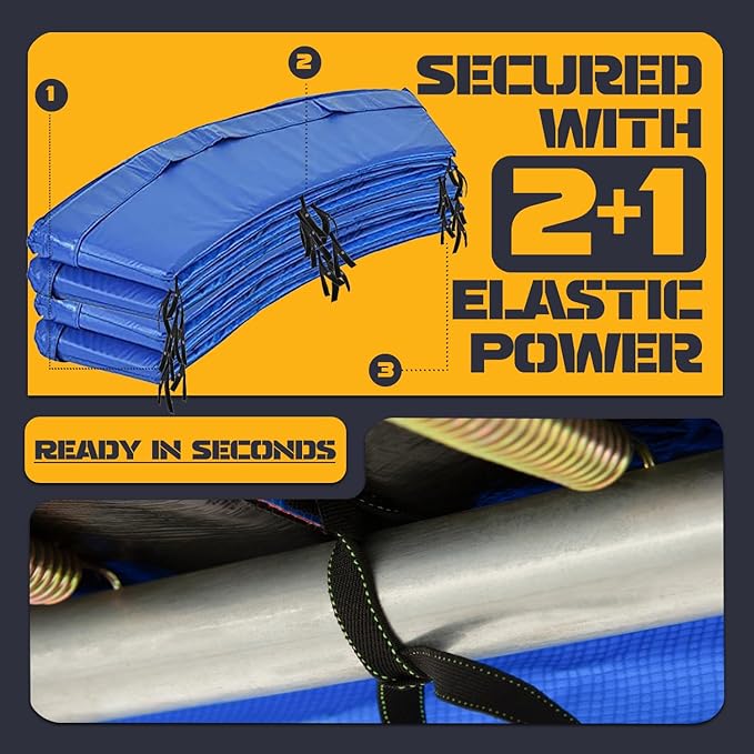 • ⭕️【 UV-Resistant & Weatherproof Trampoline Pad for Long-Lasting Use】Engineered with 2000-hour UV resistance testing, this trampoline cover blocks harmful sun rays and repels water, ensuring year-round outdoor safety. The double-reinforced elastic straps securely wrap around trampoline poles and frames, preventing shifting during play. Ideal as a 10 FT trampoline pad replacement for backyard setups, schools, or recreational centers demanding fade-proof and waterproof protection.Weather resist!