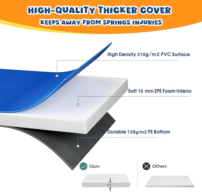 • 👨‍👩‍👧‍👧【270° All-Around Safety Protection】👨‍👩‍👧‍👧At ULTRAPOWER SPORTS, your child's safety comes first! Our trampoline pad replacement is designed to shield kids from exposed springs, preventing injuries while they jump. The extended 270° protective cover wraps around the trampoline frame, offering inside-out protection. Built for durability, it features a 0.55mm thick PVC surface + 0.6-inch protective cotton + an ultra-dense PE bottom, ensuring maximum safety, comfort and fun.