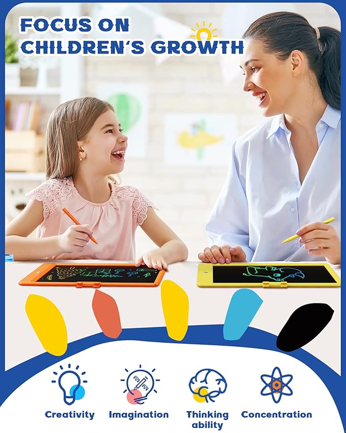 • PORTABLE AND DURABLE: The drawing board for kids is made of durable plastic, plus round corner design, anti-fall and anti-shock, no need to worry kids drop it. The drawing tablets for kids weights only 150 grams, easy to carry, place in school bags, handbags, travel bags. The doodle board also can be used in multiple places: airplane, car, restaurant, sofa, etc.