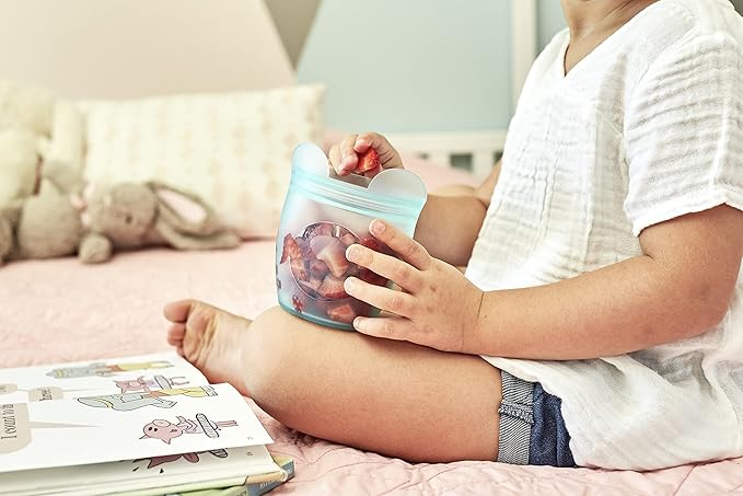Zip Top Reusable 100% Silicone Baby + Kid Snack Containers - The only containers that stand up, stay open and zip shut! No Lids! Made in the USA - Teal Bear